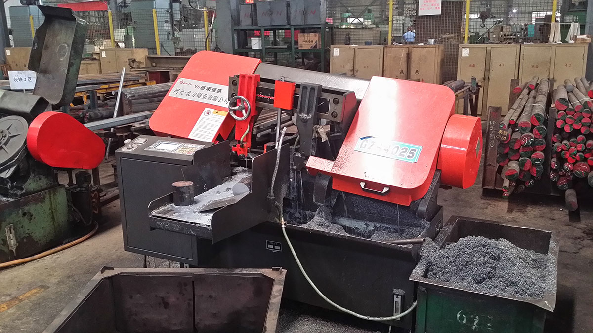 佰利乐人工上料后手动齐头,在自动状态下设定锯切长度及刀数,按运行钮、后钳松(2秒)→缸退→后钳紧、前钳松(2秒)→缸进送料(12秒/400mm可通过一次或多次送料实现定尺长度)→前夹紧、后钳松(2秒)→工进锯切(无级调速、按45#钢进刀量约35-55mm/分钟)、缸退→抬锯(12秒/250mm)→下一循环至完成设定刀数机床停。